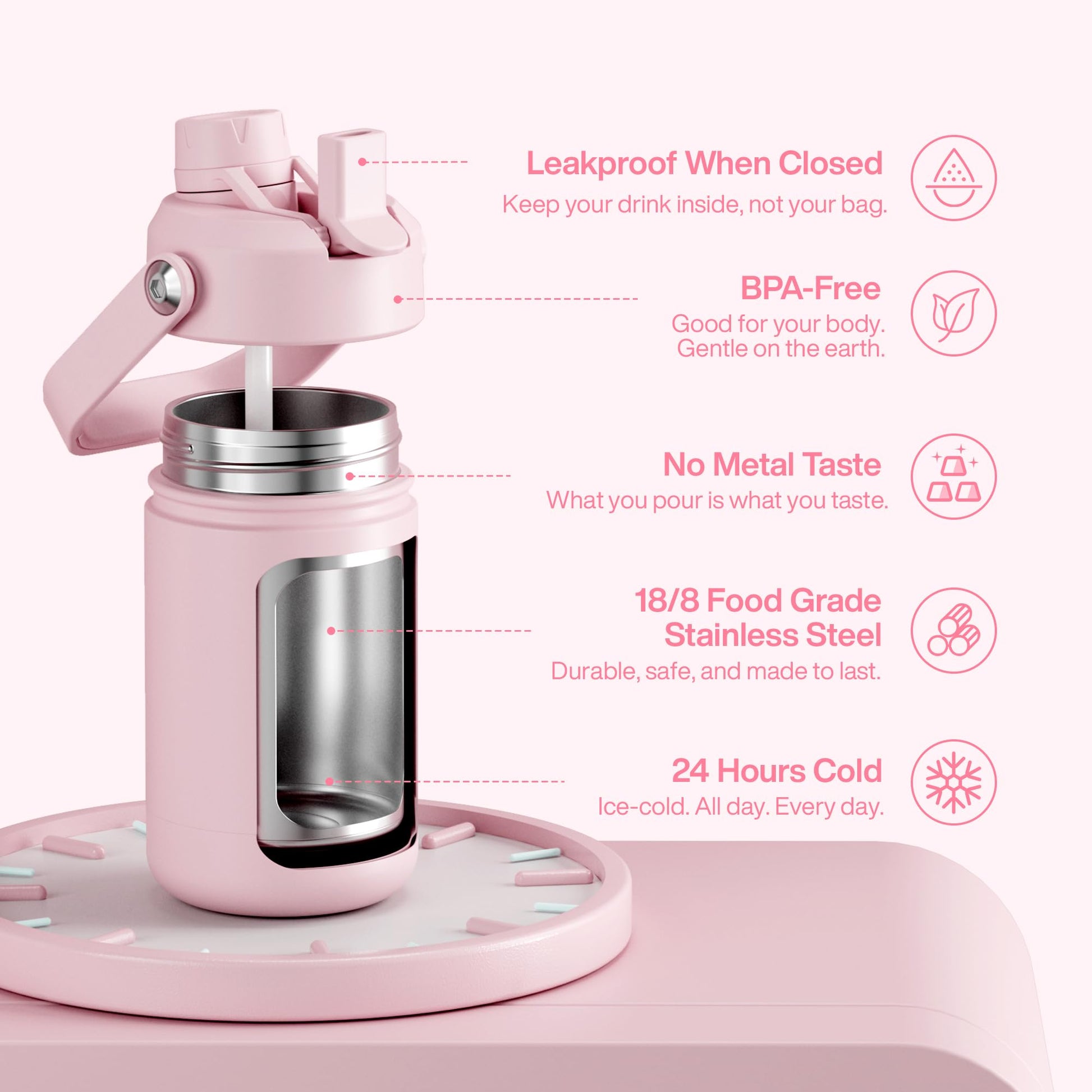 - 24 Hours Cold: Double‑wall vacuum insulation with 18/8 stainless steel keeps drinks cold for up to 24 hours, so kids always have a cold drink