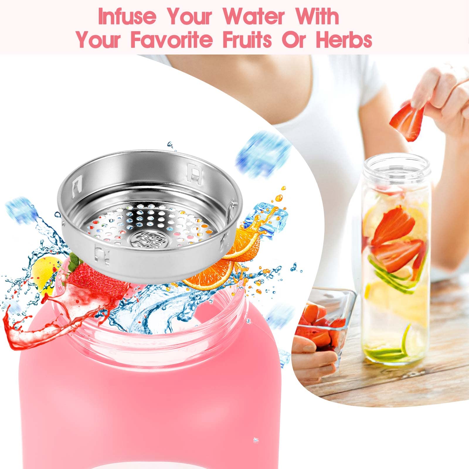 - Infuse Your Beverage - Use the stainless-steel infuser to strain fruits or herbs in our reusable glass water bottle 32oz with time marker for a delicious and healthy way to flavor your water. Silicone sleeve adds style and provides protection from slips and falls