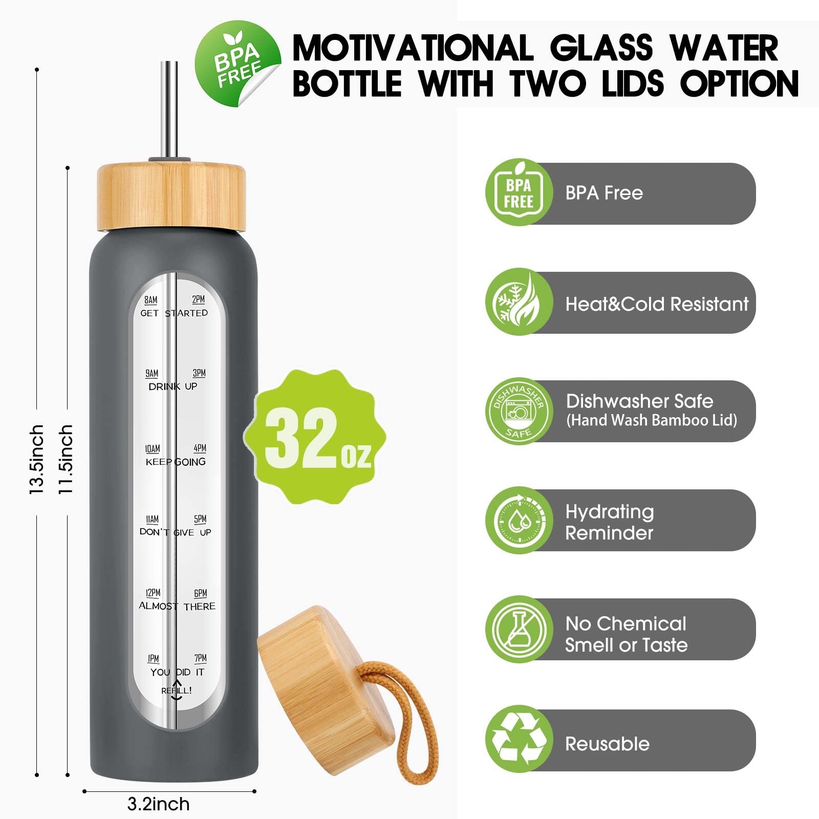 - Two Lids to Drink - Your motivational water bottle with straw comes with 1 lid with a handle, 1 lid with a straw, 1 strainer, and 1 cleaning brush. Use it at home as a tumbler or on the go as a travel water bottle. Easy to clean dishwasher safe glass water bottles perfect for daily water intake